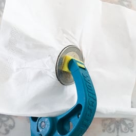 Den Lidschatten mit einem Stück Zellstofftuch abdecken und mit einer Münze (2 € passen perfekt) oder einem runden Stück Pappe pressen. Ich verwende dafür gerne kleine Zwingen aus dem Baumarkt, der Daumen reicht aber auch.