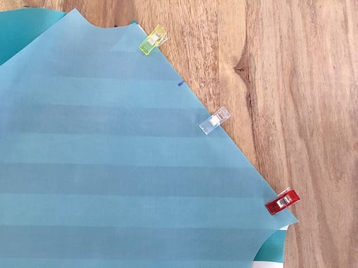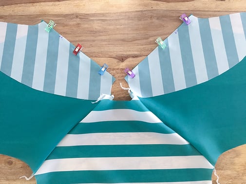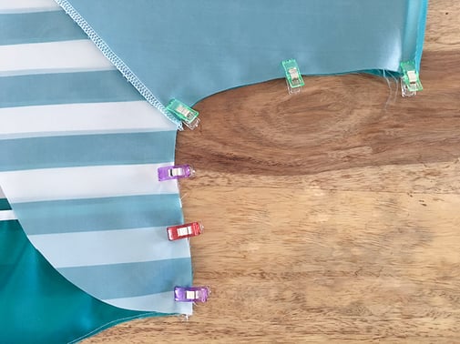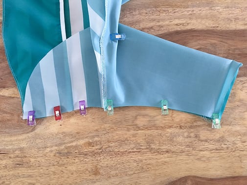 Ein kleiner Trick hilft, die stark gebogene Naht einfacher mit der Overlock nähen zu können: Ähnlich wie bei einem Abnäher wird eine Falte mit einer weiteren Klammer fest gehalten. Dadurch wird die Strecke vorübergehend «begradigt» und lässt sich problemlos nähen.