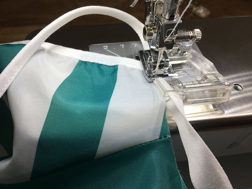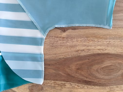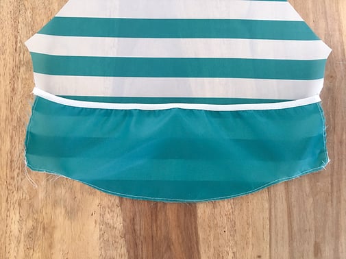 Das Lätzchen von hinten. Als nächstes wird der Rücken und der Saum des Lätzchens in einem Zug mit Falzgummi eingefasst.
