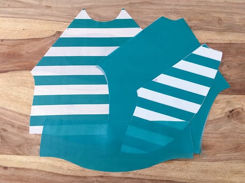Alle Teile zugeschnitten: Das Vorderteil und die Tasche je 1x im Stoffbruch, das Ärmel- und Rückenteil je 2x (spiegelverkehrt).