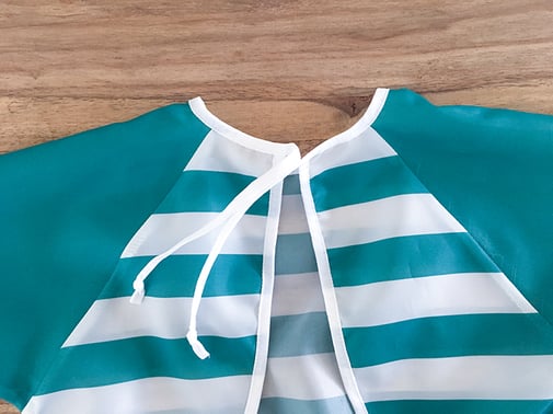 Bevor das Halsloch eingefasst wird, ca. 15 cm vom Falzgummi zusammennähen. Das wird später das Band zum Schliessen des Lätzchens.