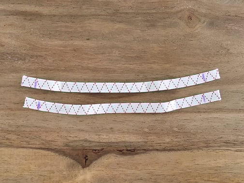 Für die Ärmelbündchen zwei Gummis zuschneiden. Bei mir sind es 12 cm plus je 1 cm Nahtzugabe pro Seite (Markierung). Da der Gummi gut passen muss, damit der Brei nicht hineinlaufen kann, am besten das Handgelenk abmessen und die Nahtzugabe dazugeben.