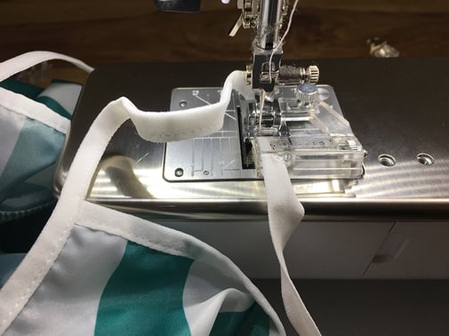 Die offene Kante vom Halsausschnitt in den Gummi einlegen weiternähen.