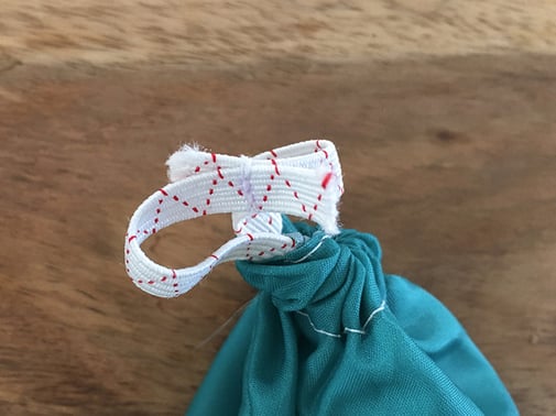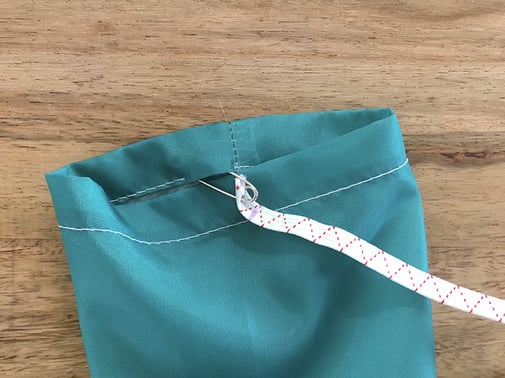 Den Gummi mit Hilfe einer Sicherheitsnadel durch den entstanden Tunnel ziehen. Dabei aufpassen, dass das Ende nicht hineinrutscht und der Gummi sich nicht verdreht.