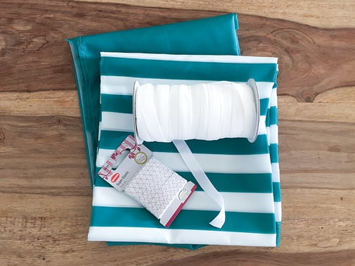 Als Stoff dient ein Duschvorhang (z.B. Vadsjön). Zusätzlich braucht es ca. 2.2 Meter Falzgummi und ca. 30 cm Gummi (7 mm).